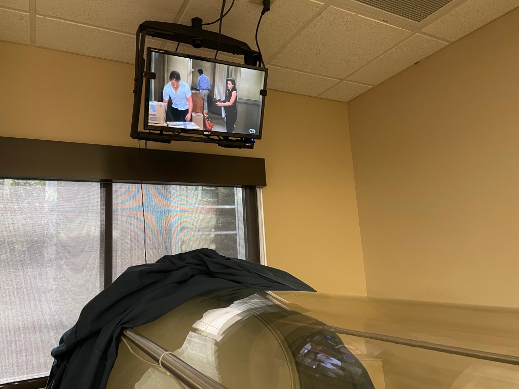 There is at least a TV outside the glass tube that you can watch. You can even pick your channel from a very large selection. I typically put it on TBS and watch 2 Broke Girls and Friends. It’s comfortable and not painful at all.