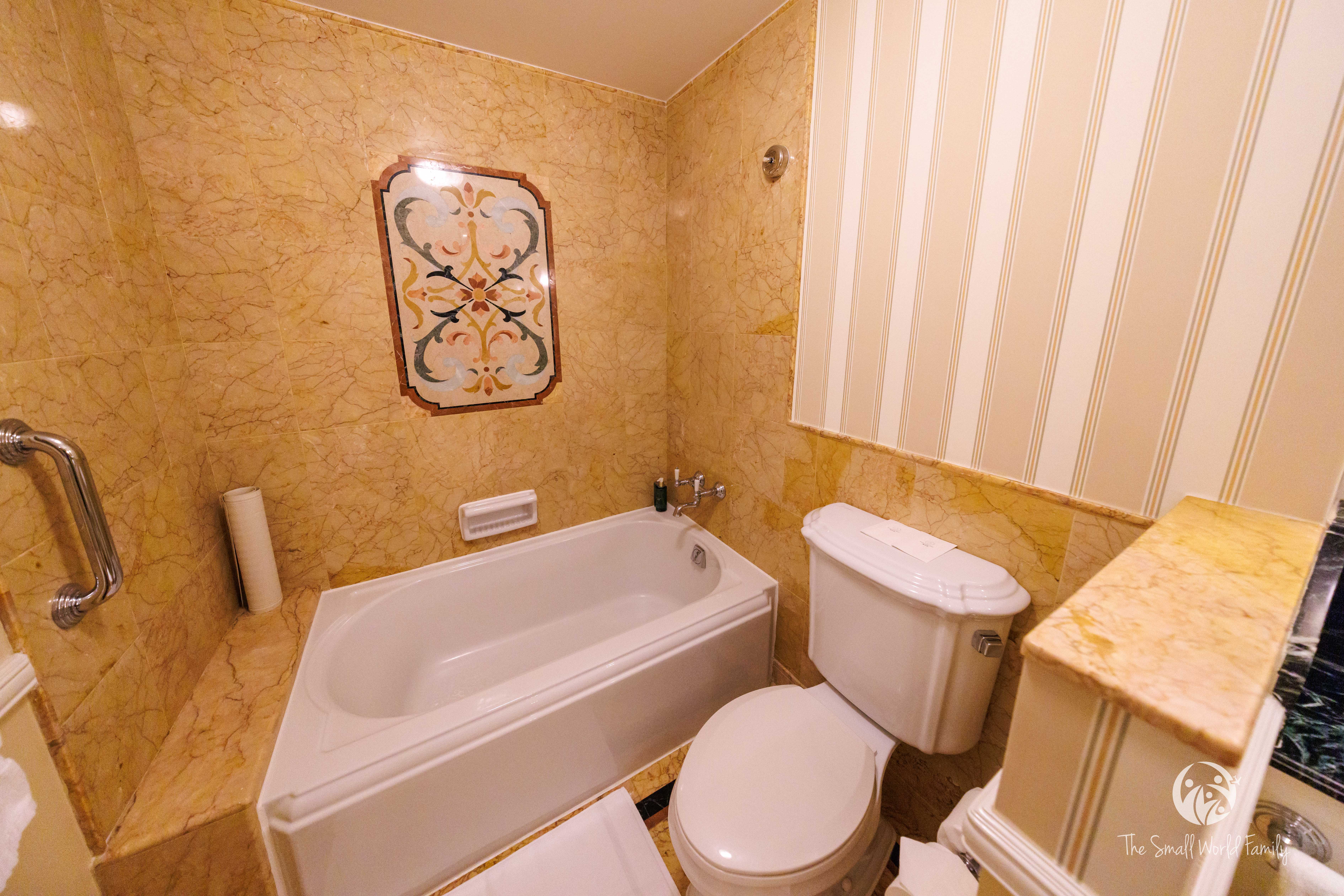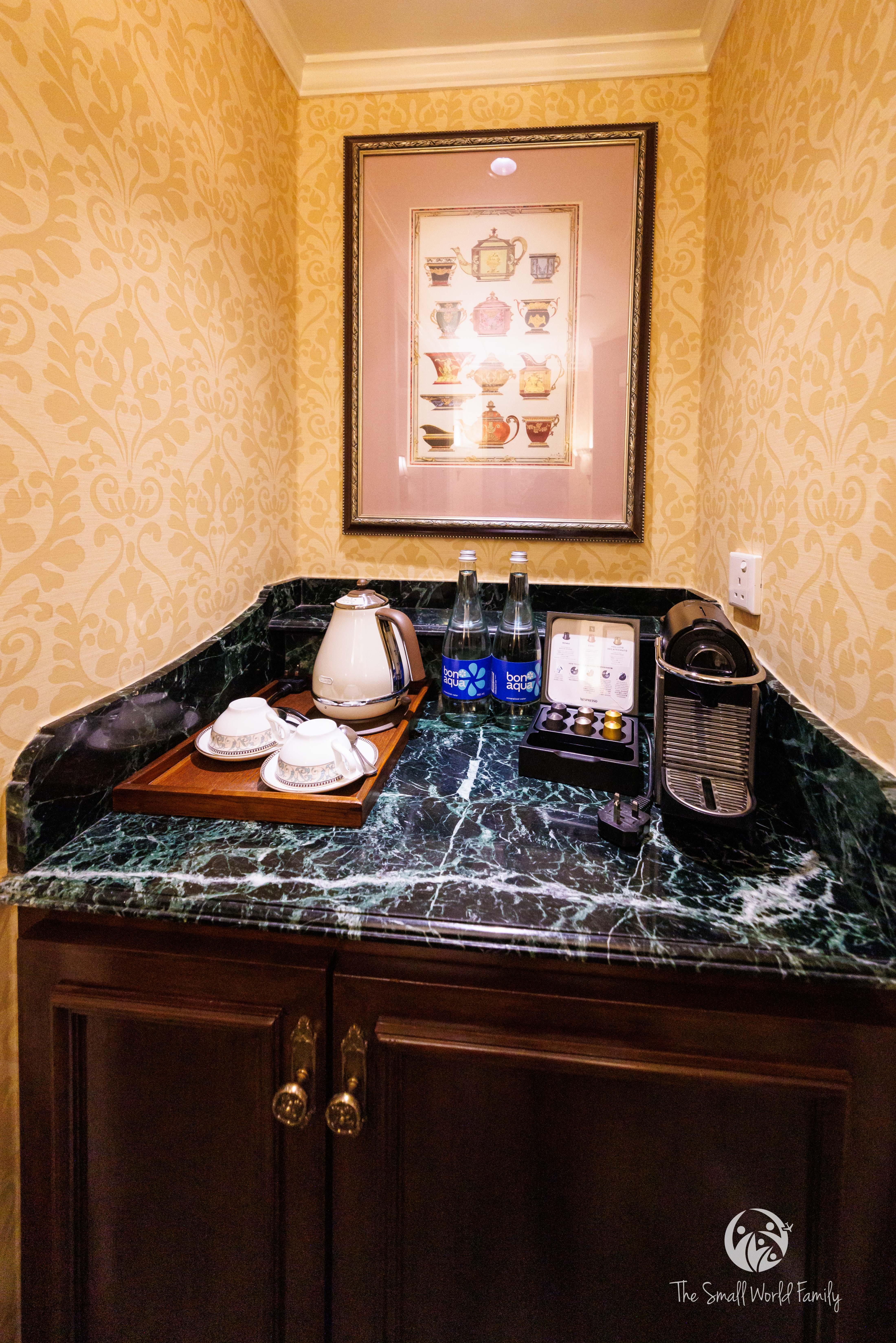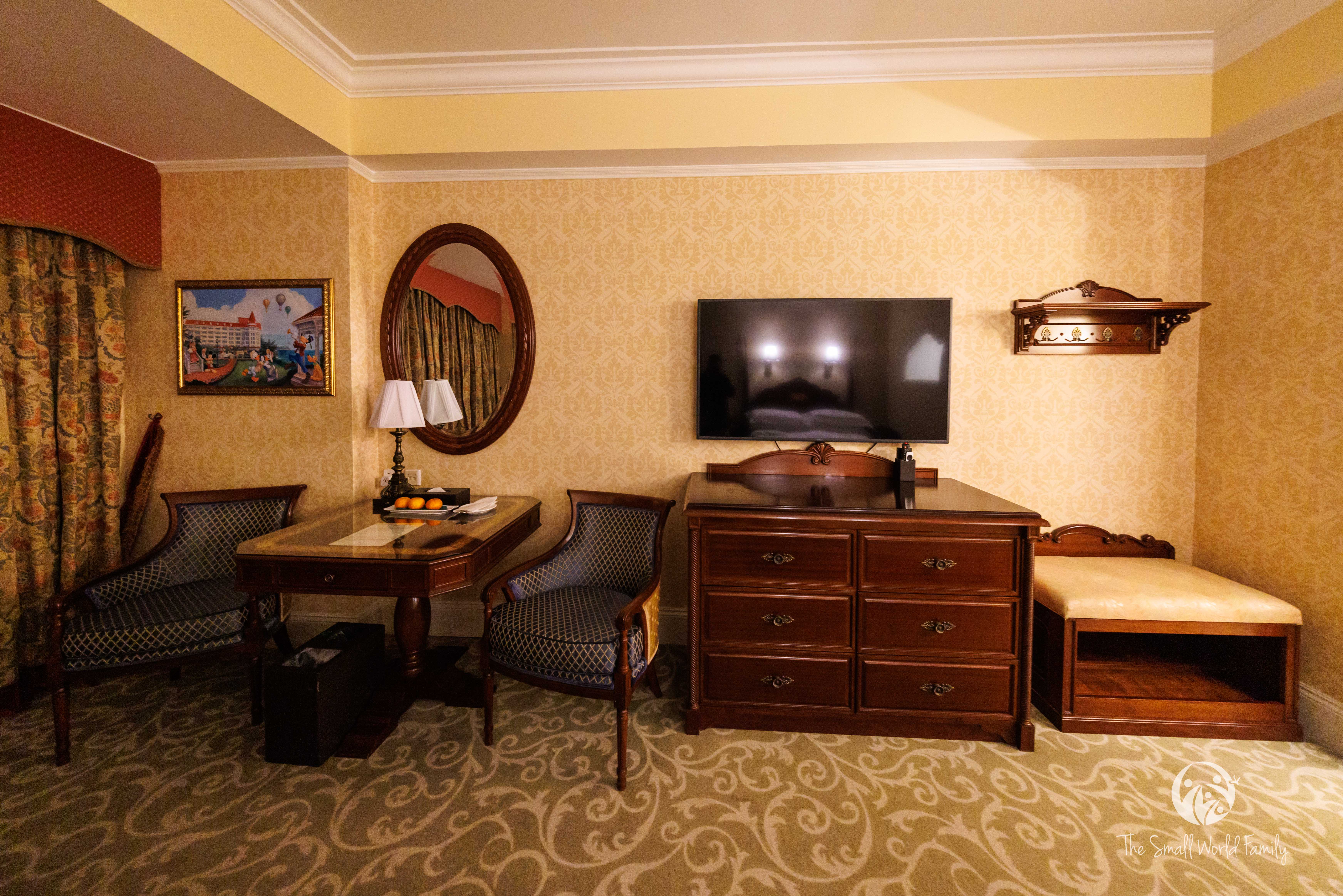That being said, it was about what I expected from the pictures we had seen online, and was very clean and well maintained. I feel it could have used a refresh, as it definitely had more of a mid 2000s vibe with all the dark furniture and heavy drapes. It did come with the standard amenities you would expect from a flagship Disney hotel such as tea and coffee, complimentary minibar, robes, slippers, amenity kits, and something we discovered is very popular in Asia, free plastic souvenir cups or mugs.
