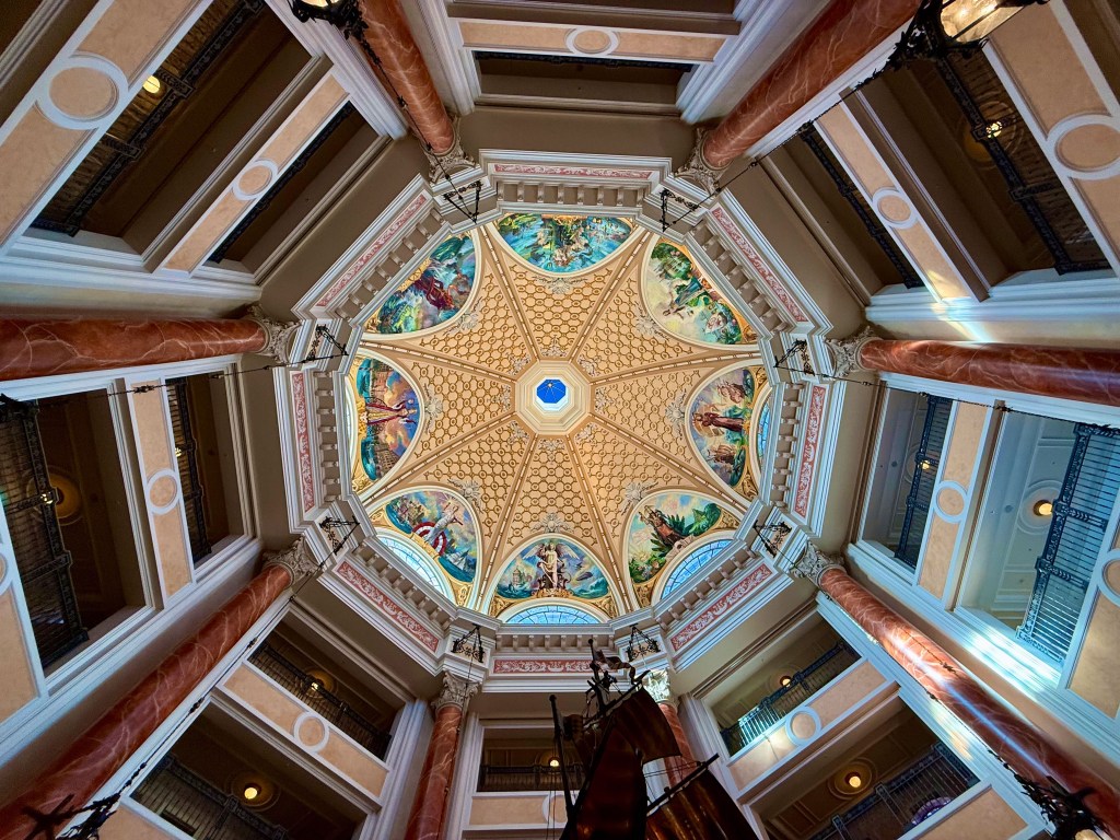 I get to the lobby lobby and I am totally by myself as there is no one up at 6:00AM aside from Bell Services. I honestly canโt believe that for Notre Dameโs biggest game in 12 years I am watching it on an iPad in the lobby of a hotel in Tokyo Disneyland. I look up and say a quick Hail Mary and ask God to please help Notre Dame. As I do so I notice that the lobby atrium is absolutely stunning.